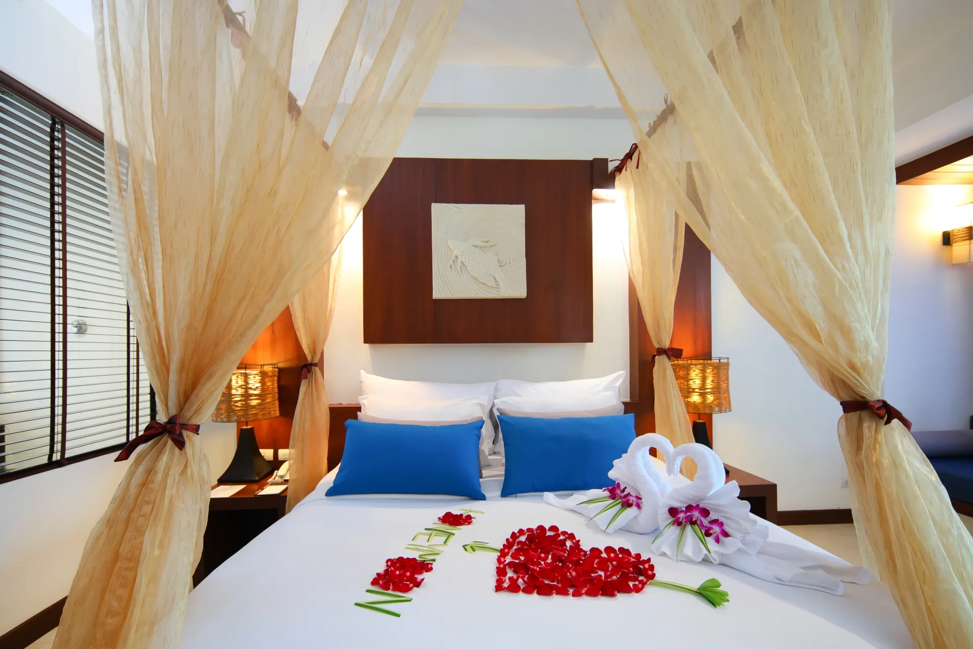 This room has a double bed or twin beds. Room service is delivered by boat.